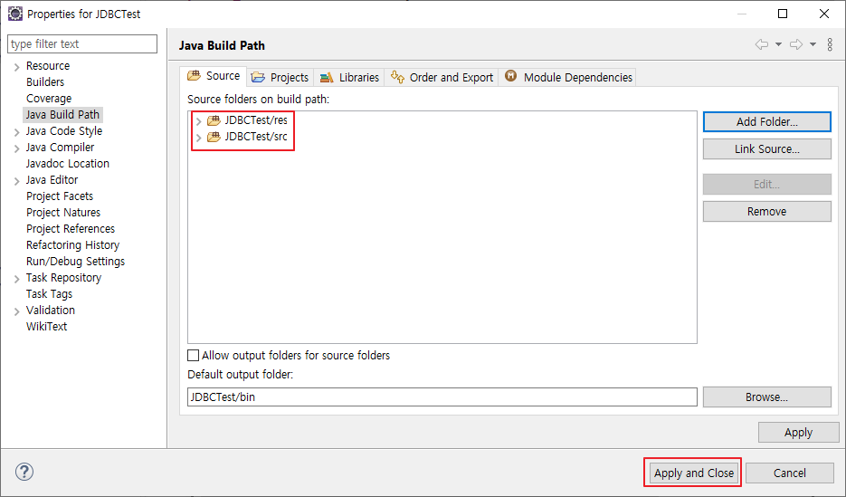 사용 폴더에서 오른쪽 마우스 클릭 > Build Path > Configure Build Path
