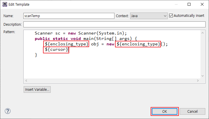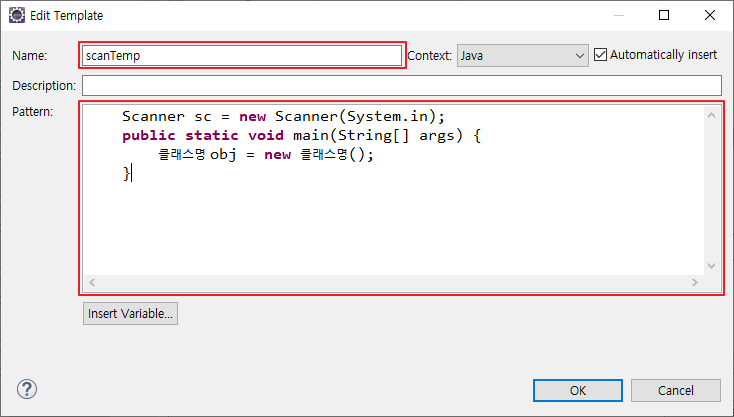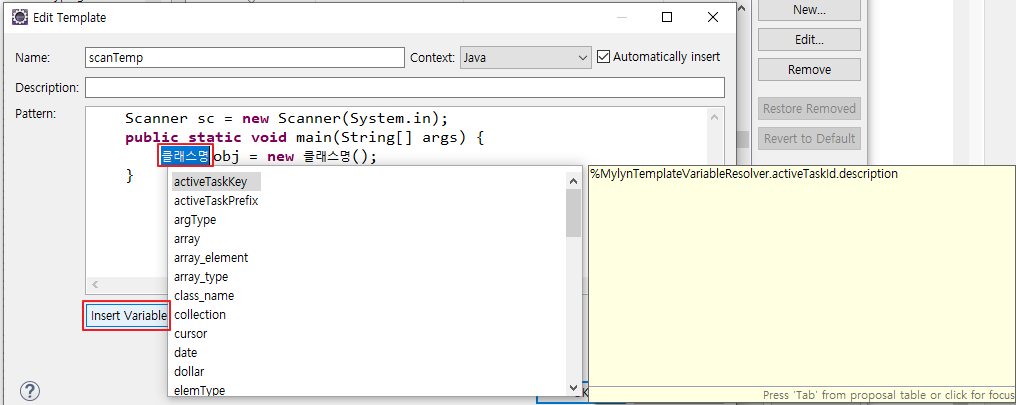 5. 유동적으로 바뀌는 명칭의 경우 드래그 후 Insert Variable 을 클릭하여 변경한다.