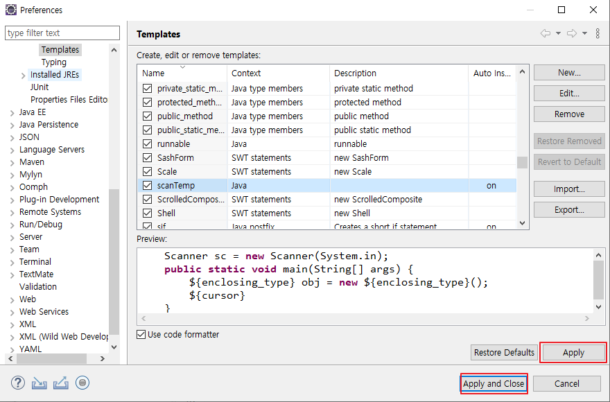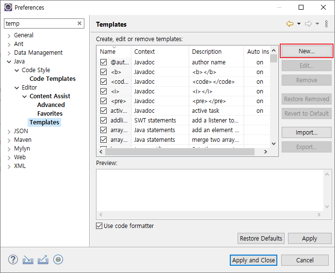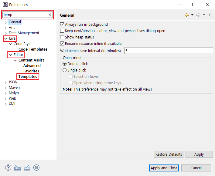 2. 입력창에 temp을 입력한 후 Java -> Editor -> Templates 을 클릭한다.