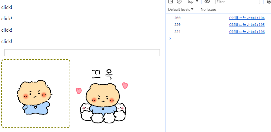 | toggleClass(class) | 매치된 요소들에 지정된 클래스가 적용되지 않았다면 적용하고, 이미 적용되어 있다면 제거 |