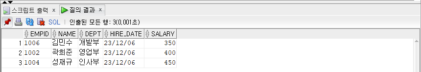 VALUES('1006','김민수','개발부',SYSDATE,'1985.10.12','대전시 서구 갈마로29', 'ERP프로그램', 350);