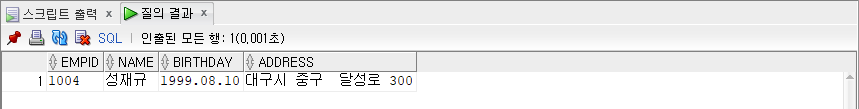 VALUES('1004','성재규','인사부',SYSDATE,'1999.08.10','대구시 중구 달성로 300', '급여관리', 450);