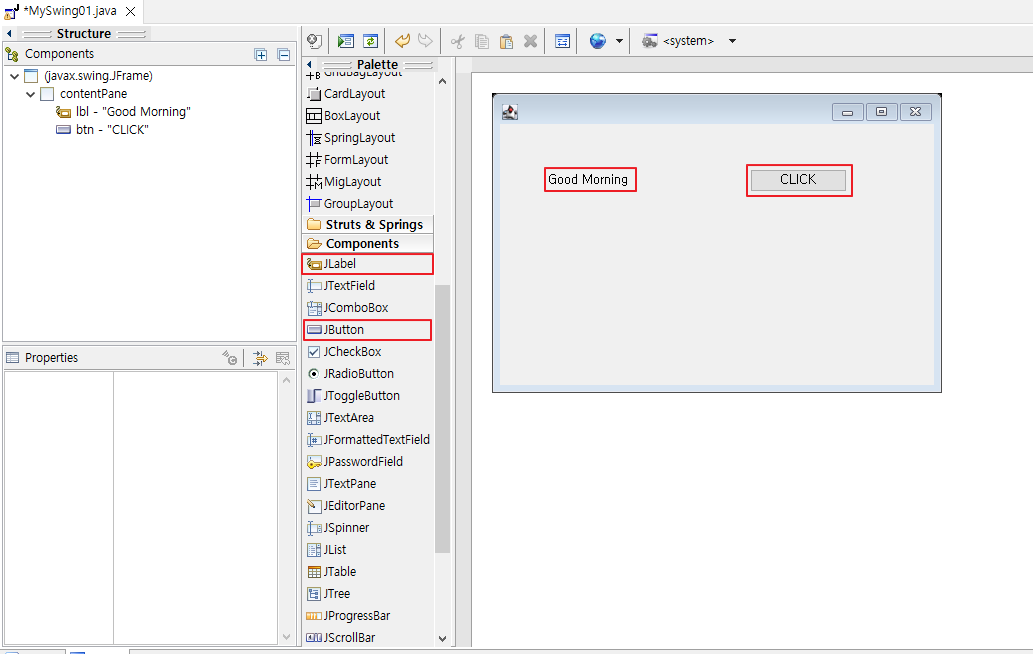 5. JLabel, JButton 클릭 후 패널 클릭하여 생성