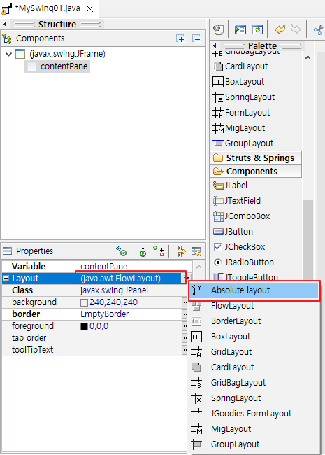 4. 라벨이 아닌 옆 공간 클릭 > Layout 클릭 > Absolute layout 클릭