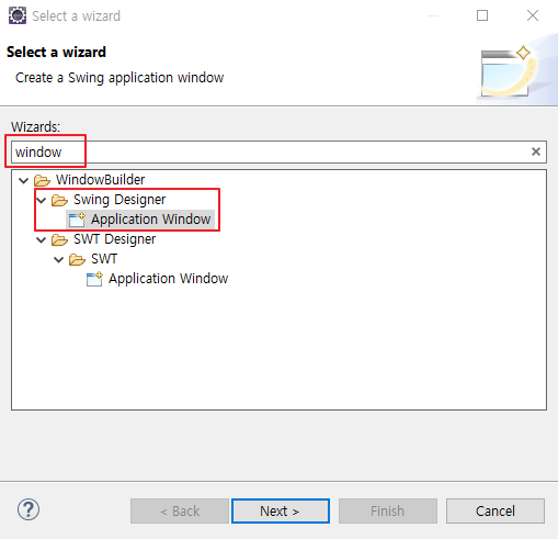 1. Ctril + N > WindowBuilder > Swing Designer > JFrame > Next 클릭