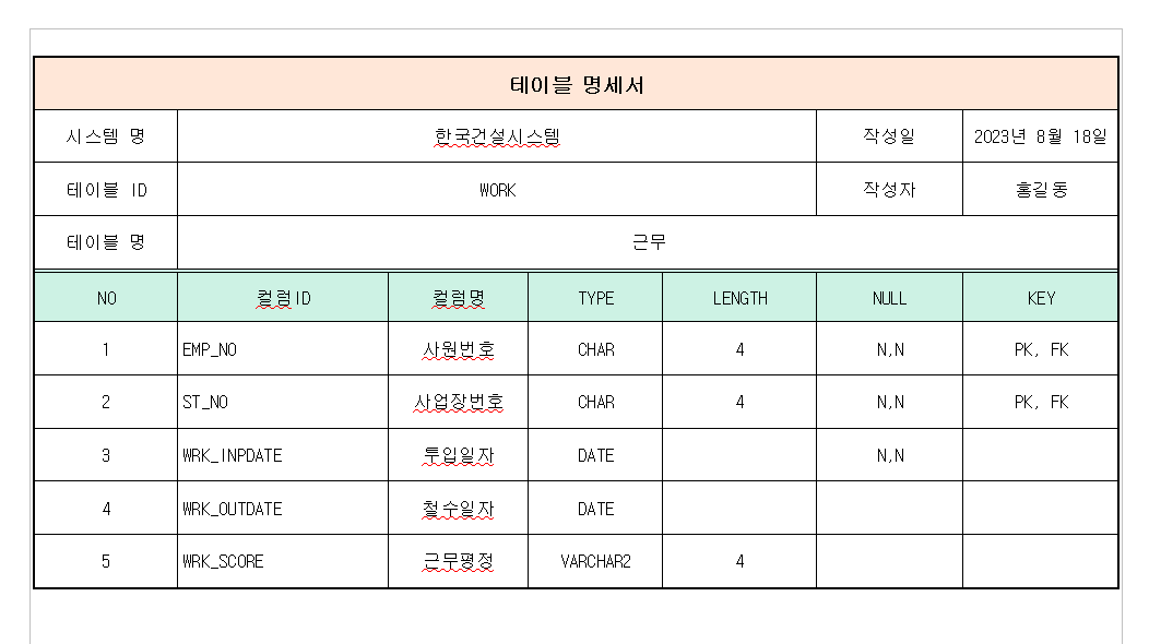 · 사업장은 (사업장번호, 사업장명, 주소, 전화번호, 공사금액, 투입인원, 시공일자, 예상완공일, 완공일, 비고)의 속성을 갖는다.