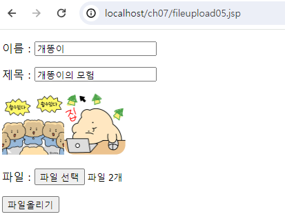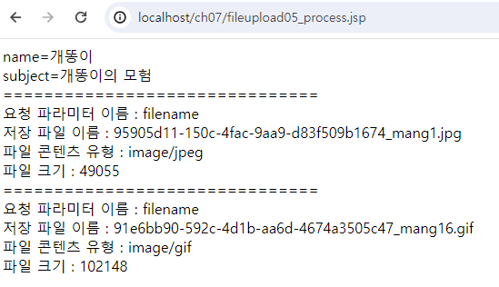 요청파라미터 : {name=개똥이, subject=개똥이의 모험, filename=파일객체}