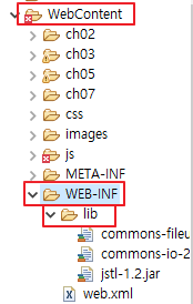 commons-fileupload.jar, commons-io.jar 파일을 배포 사이트에서 다운로드해서 사용.