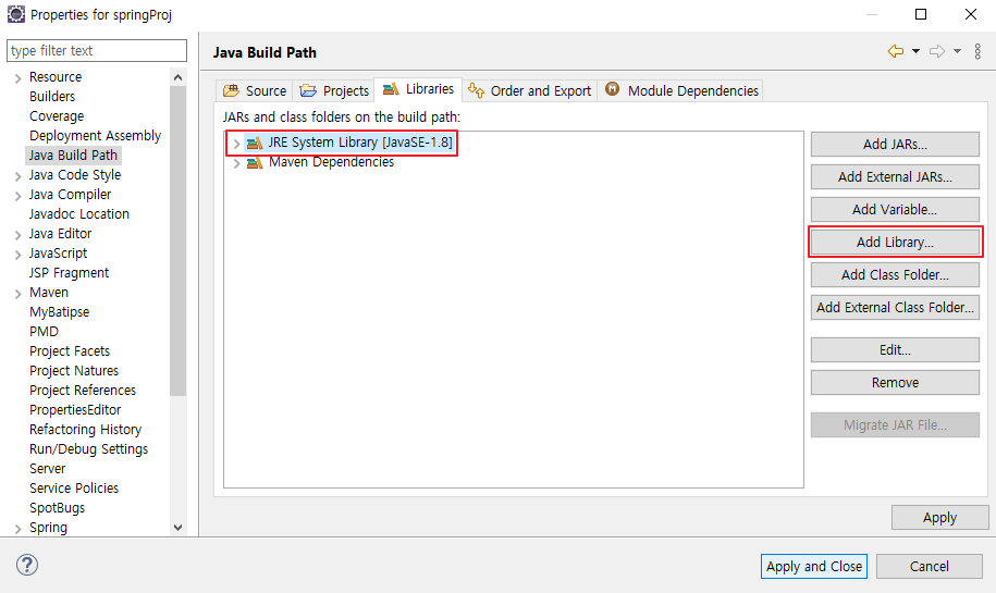 2. 없을 시 Add 클릭 > Java Build Path Entries 클릭 > Next 클릭 후 추가