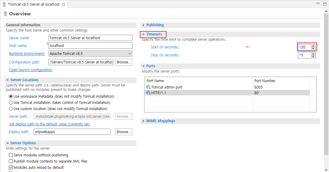 4. Timeouts 클릭 > 시간초 120초로 변경 > Ctrl + S로 저장