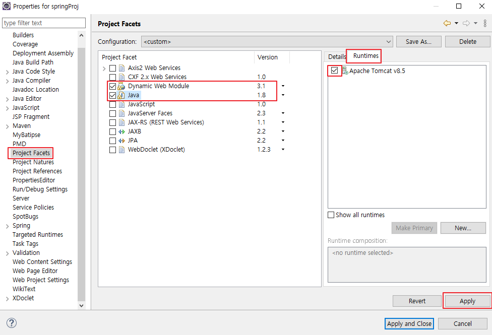 1. Project Facets 클릭 > Dynamic, Java 버전 변경 > Java 클릭 > Runtimes 클릭 > 체크 박스 클릭 > Apply 클릭