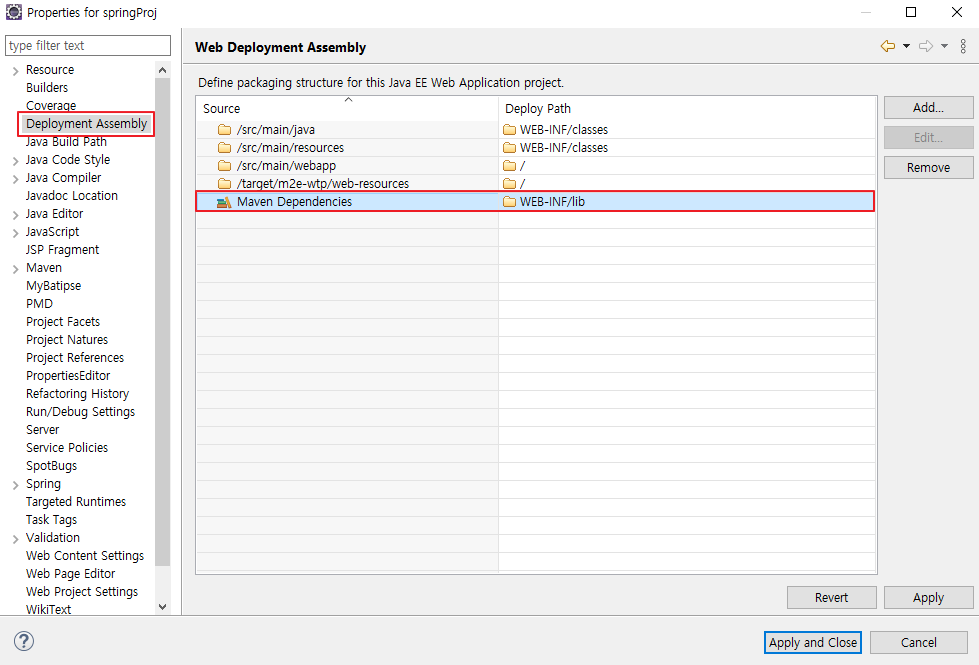 1. Deployment Assembly 클릭 > Maven Dependencies 가 있는지 확인