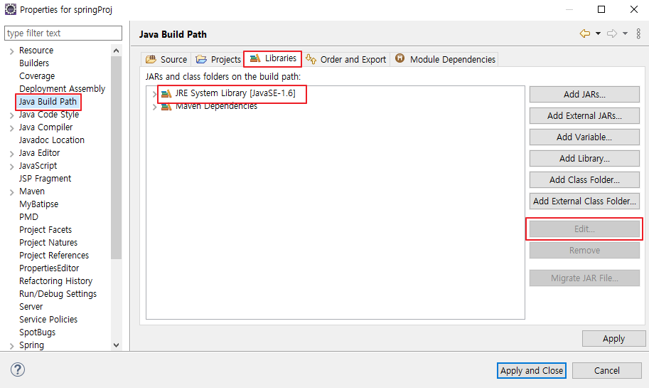 2. Java Build Path 클릭 > Libraries 클릭 > JRE 클릭 > Edit 클릭