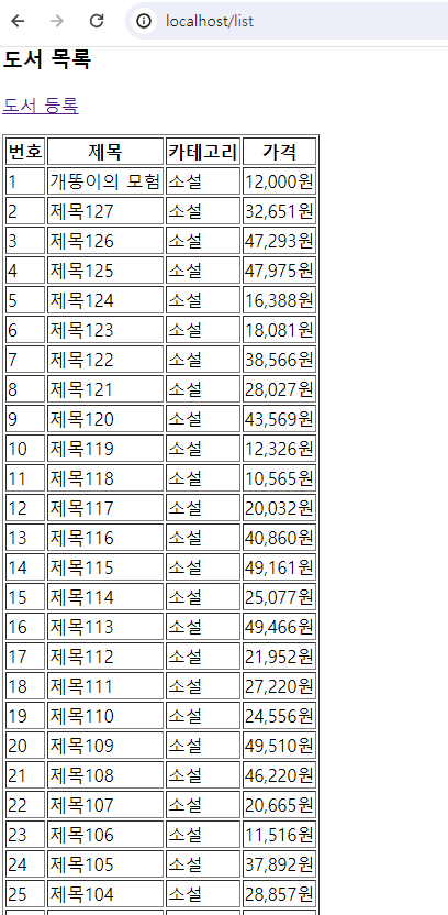 <!-- bookVO(후)=>{"bookId":1,"title":"총알탄 개똥이","category":"소설","price":10000,"insertDate":""} -->