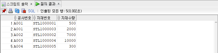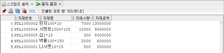 select itm_no 자재번호, itm_name 자재명, itm_qty 자재수량, itm_price 자재금액