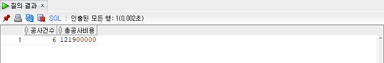 select count(st_no) 공사건수, to_char(sum(st_amount), '999,999,999,999') 총공사비용 from site; -- 숫자 사용 시 세 자리씩 끊고 싶다면 char로 변환한 후 추가하여야 한다.