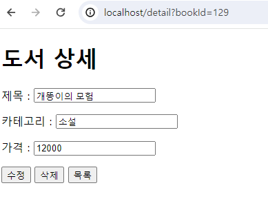 요청파라미터 : {bookId=127, title=개똥이의 모험2, category=소설2, price=12002}