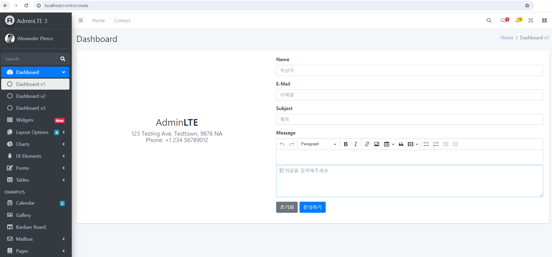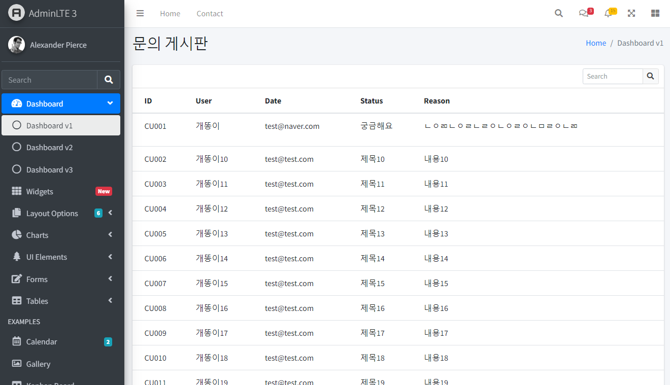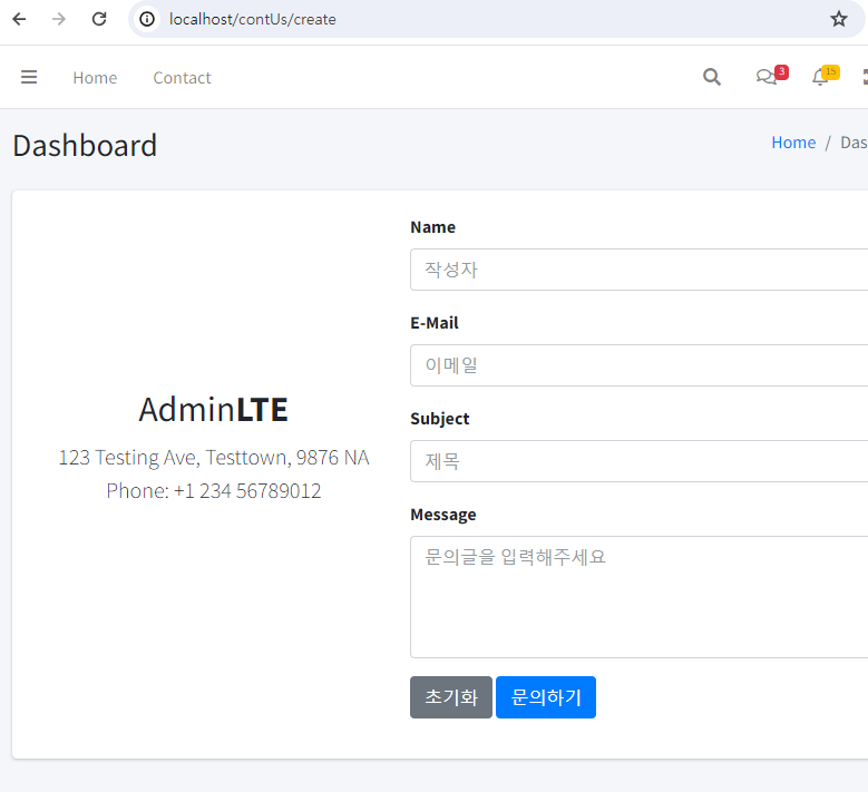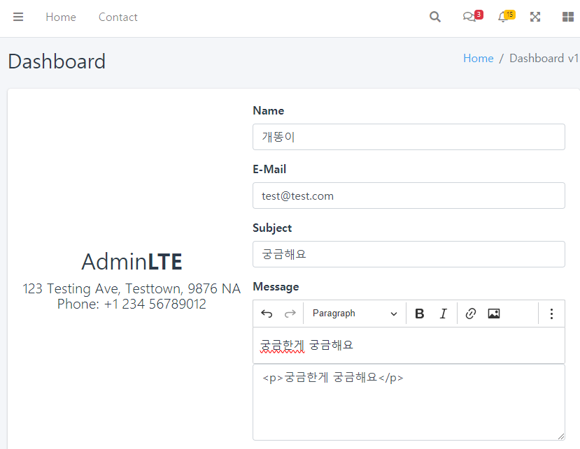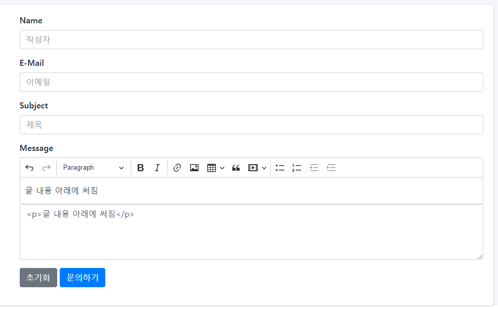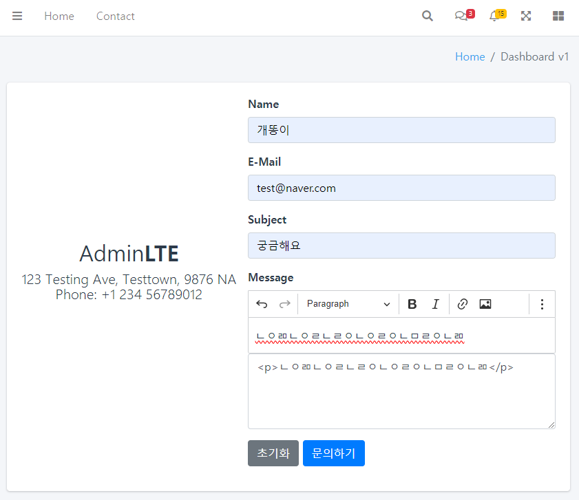 요청 파라미터 : {name=개똥이, email=test@test.com, subject=궁금해요, message=궁금한게 궁금해요}