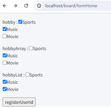 <!-- 컨트롤러에서 매개변수로써 List<String> hobbyList -->