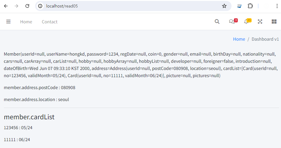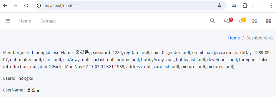 //Model 객체에 자바빈즈 클래스 객체를 값으로만 전달할 때는 뷰에서 참조할 이름을 클래스명의 앞글자를 소문자로 변환하여 처리함