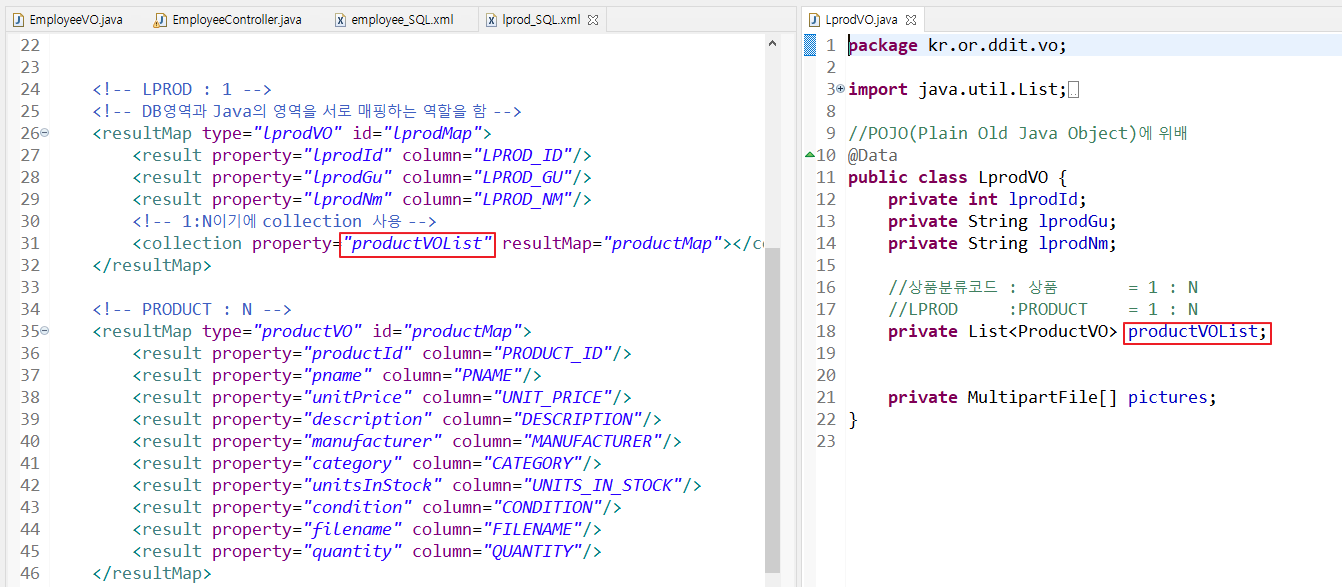 lprodVO에서 1:N으로 사용했기에 collection 을 사용 (collection의 property의 이름은 vo에 있는 이름과 같아야 함)