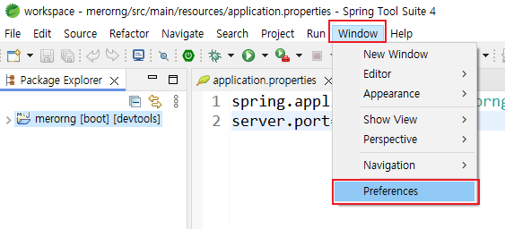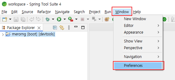 4. Window > Preferences 클릭