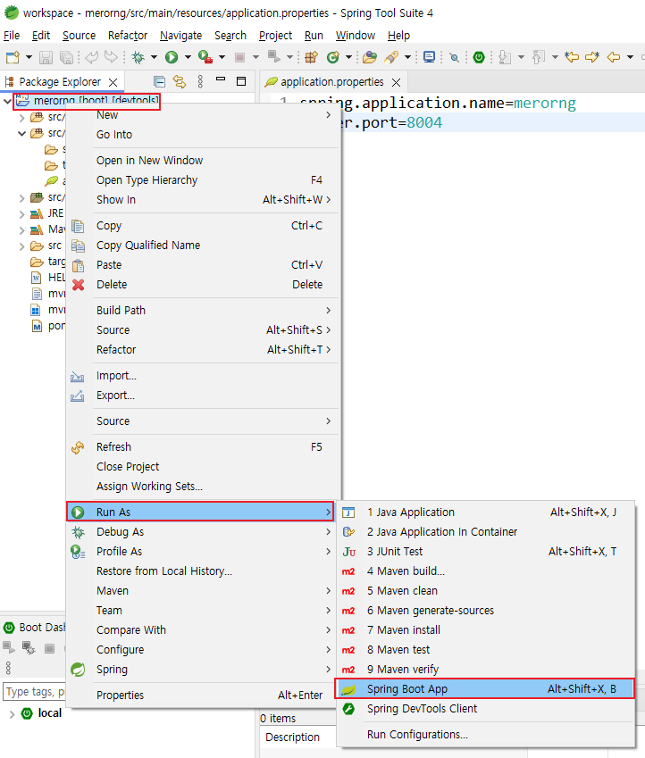 1. 프로젝트 오른쪽 마우스 클릭 > Run As > Spring Boot App 클릭