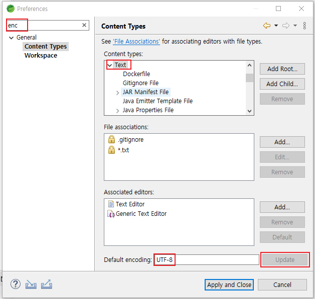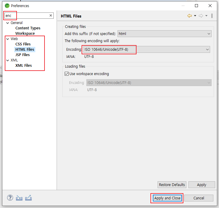 5. enc 검색 > Web과 XML의 인코딩 UTF-8인지 확인 및 변경 > Apply and Close 클릭