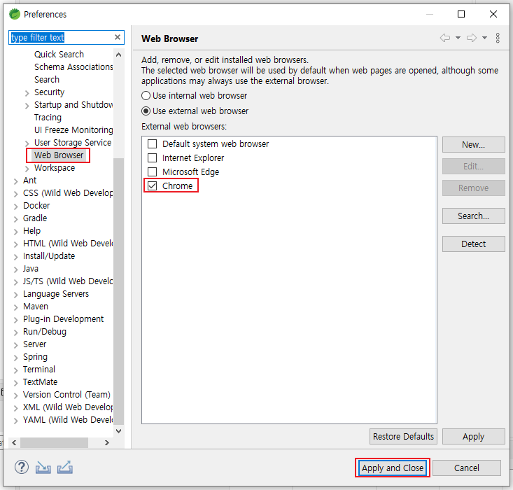 3. Web Browser 클릭 > Chrome 클릭 > Apply and Close 클릭