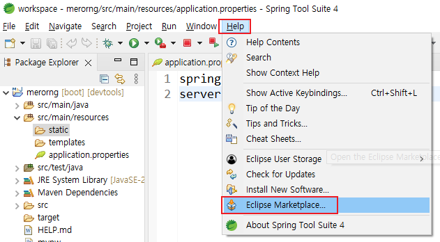 1. Help > Eclipse Marketplace 클릭