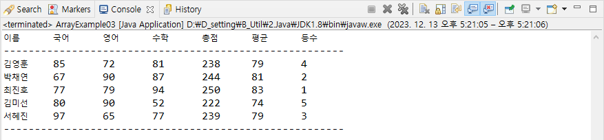 System.out.println("이름\t국어\t영어\t수학\t총점\t평균\t등수");