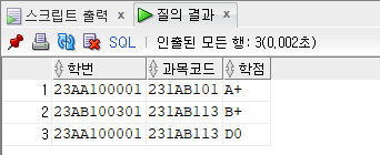 1. 2023년도 1학기 수강생들의 학번, 과목코드, 성적을 내림차순 성적순으로 모두 조회하시오.
