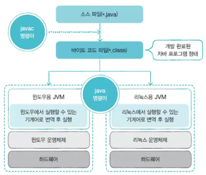 바이트 코드 파일은 운영체제(os)에서 바로 실행할 수 없기에 컴파일이라는 과정을 거져 완전한 기계어로 변경해줘야 한다. 기계어로 변환하는 과정을 매번 할 수 없어 만들어진 것이 자바 가상 기계(JVM)이다.