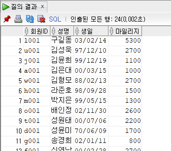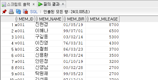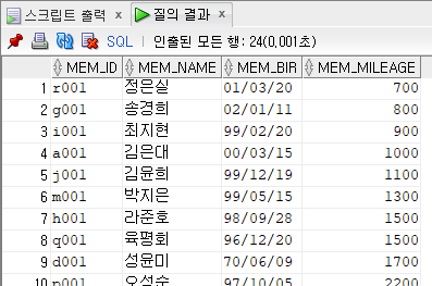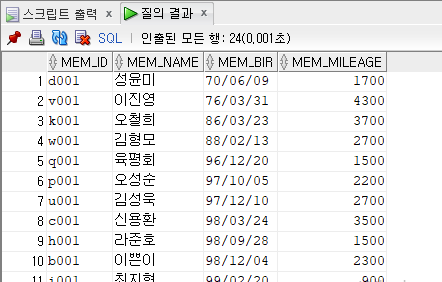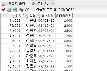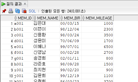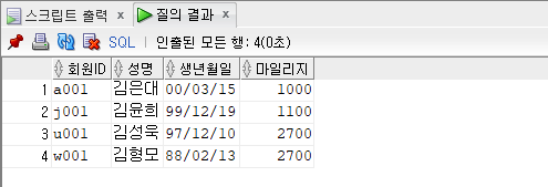 select mem_id 회원ID, mem_name 성명, mem_bir 생년월일, mem_mileage 마일리지 from member