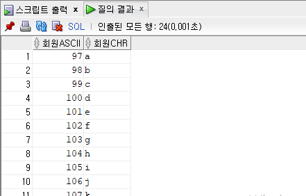 -- ASCII 값을 문자로, 문자를 ASCII값으로 변환