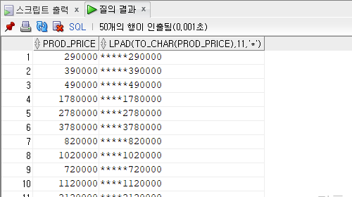 select prod_price, lpad(to_char(prod_price), 11, '*') from prod;