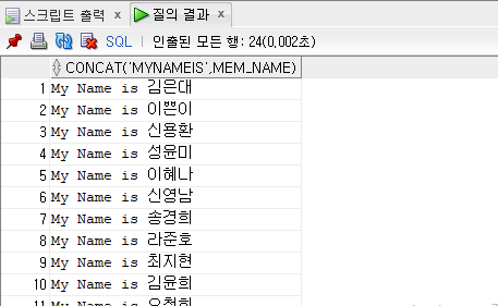 -- 두 문자열을 결합 연산자 ( || , concat)