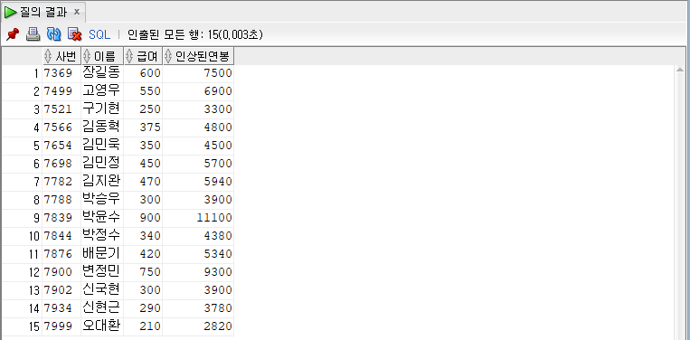 1. 덧셈연산자를 이용하여 모든 사원에 대해서 연봉에 대해 300만원의 급여 인상을 계산한 후 사원의 사번, 이름, 급여, 인상된 연봉을 출력하시오.