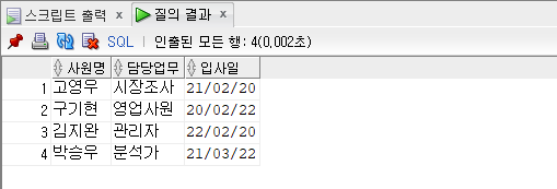 -- 12. 2021년도에 입사한 사원의 이름과 입사일을 출력하시오.