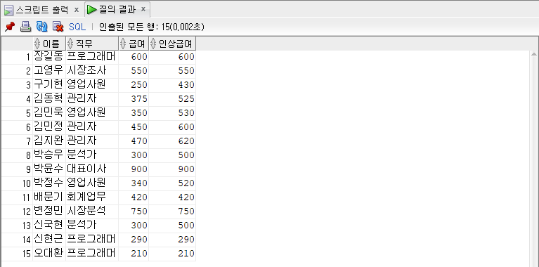 이름, 직무, 급여, 인상급여 순으로 나타내시오.