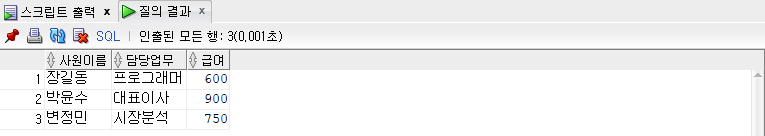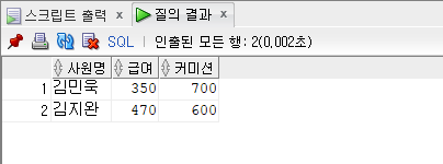 select ename 사원명, sal 급여, comm 커미션 from emp