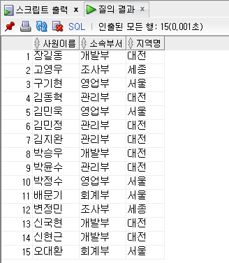 23. NATUAL JOIN을 이용하여 대전에 근무하는 모든 사원의 이름, 업무, 부서번호 및 부서명을 출력하시오.