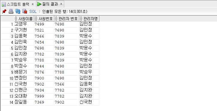 -- 24. SELF JOIN을 사용하여 사원의 이름 및 사원번호를 관리자 번호, 관리자명을 함께 출력하시오.