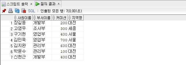 select emp.ename 사원이름, dept.dname 부서이름, emp.comm 커미션, dept.loc 지역명