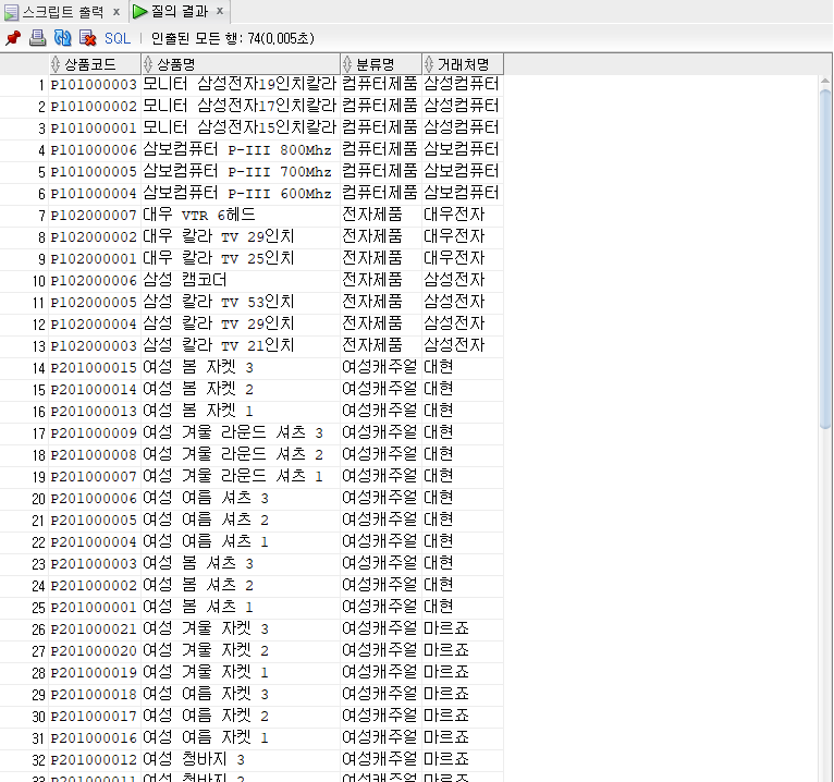 27. 상품테이블에서 상품코드, 상품명, 분류명, 거래처 명을 조회하시오.