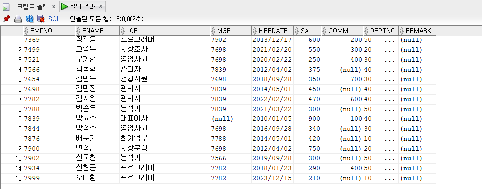 -- 1. emp 테이블에 remark 3000바이트 크기로 필드를 삽입하시오.