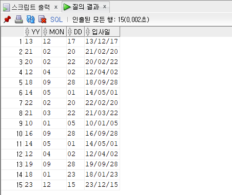 select substr(hiredate, 1, 2) YY, substr(hiredate, 4, 2) MON, substr(hiredate, 7, 2) DD, hiredate 입사일 from emp;