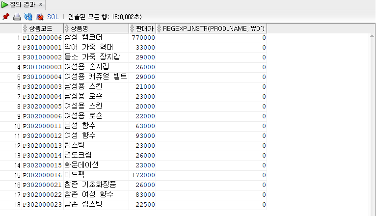 -- 상품명 중 숫자가 없는 것들이 0 => regexp_instr(prod_name, '\d') = 0
