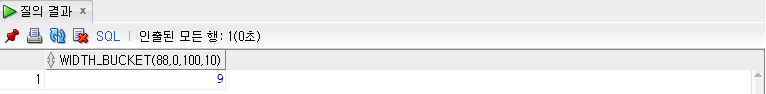 -- width_bucket(c, min, max, b) : min과 max 범위 중에 b 구간으로 나눈 후 c가 어디에 속하는지 확인