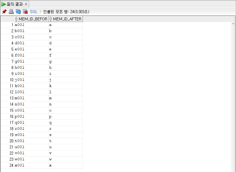 replace(substr(mem_id, 2) + 10, '11', '011') -- 001에 10을 더한 후(11) 11을 011로 변경